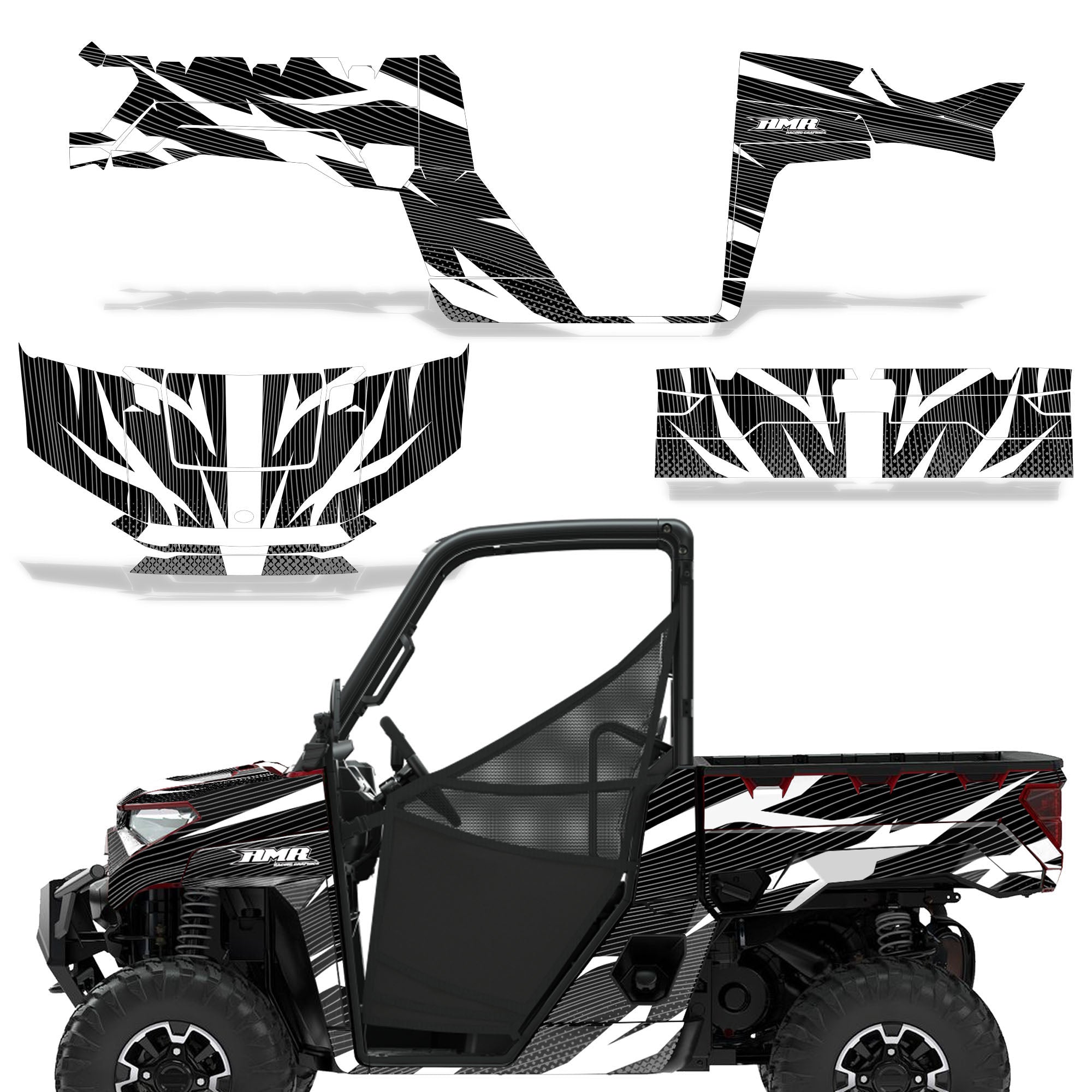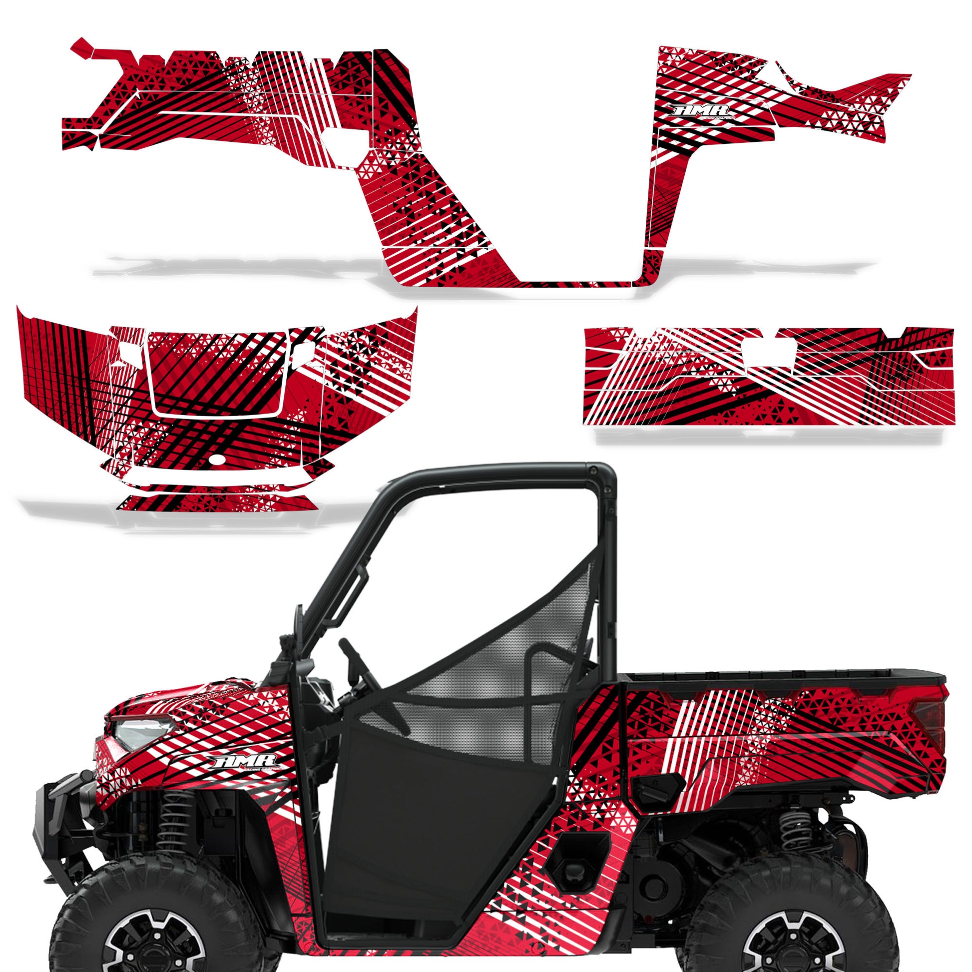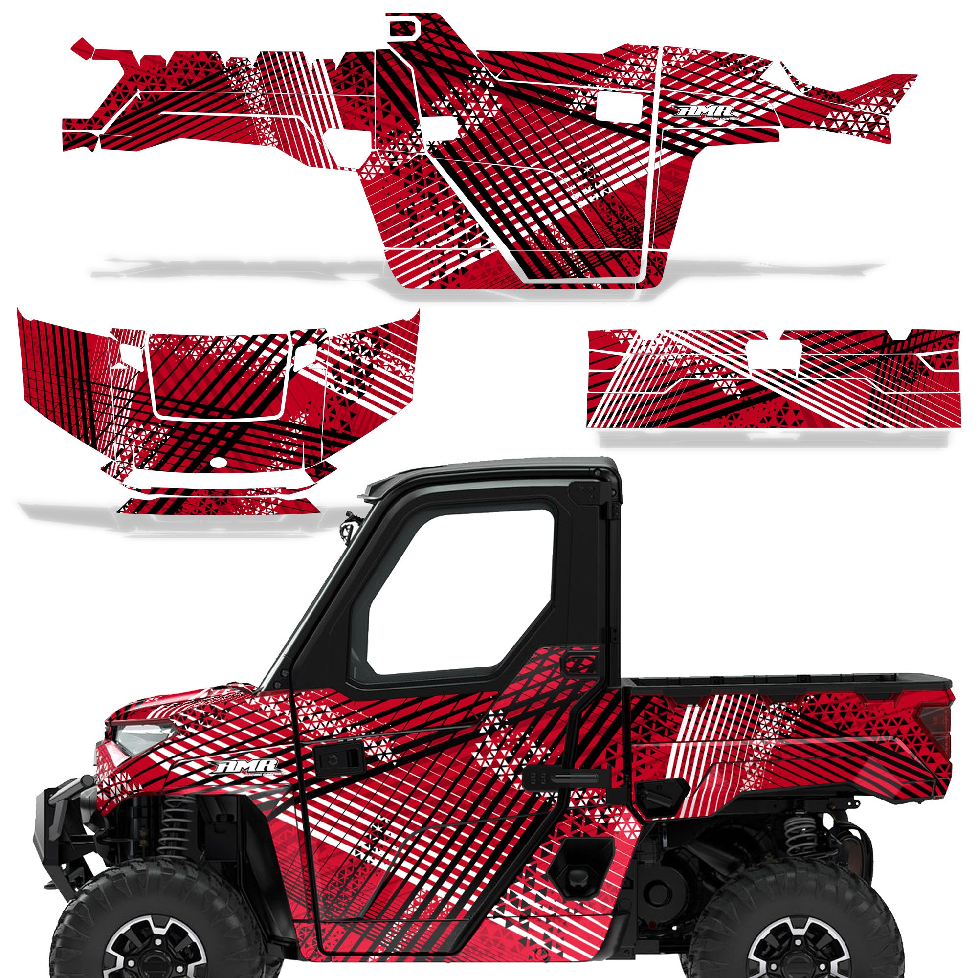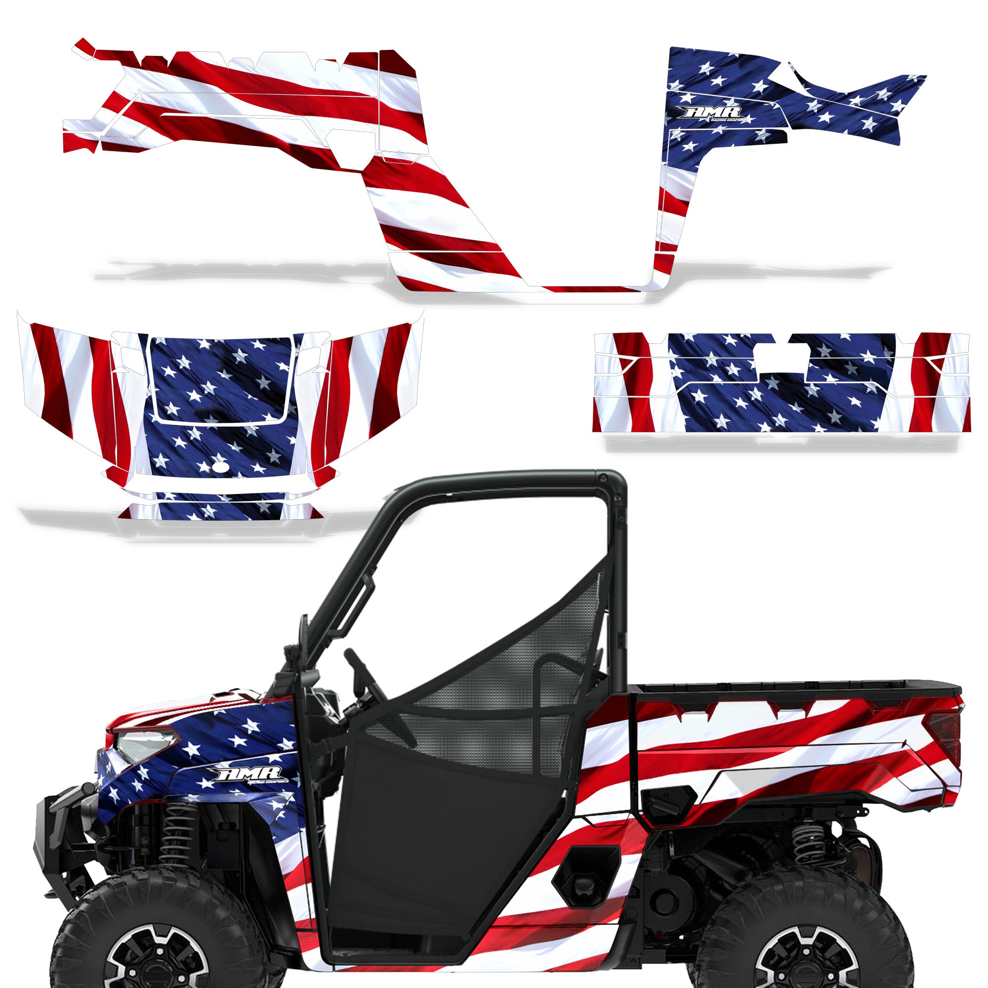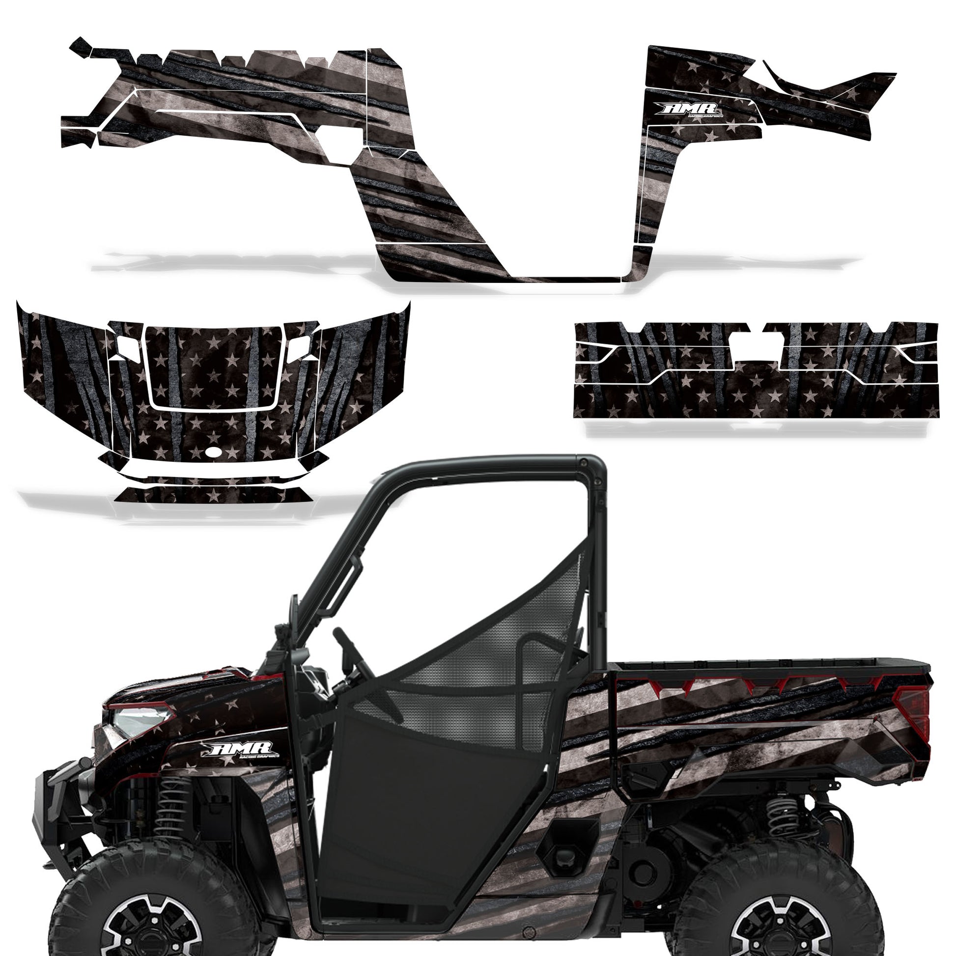 Polaris Ranger XP Premium Graphics are produced to order and may take up to 5 business days to manufacture. All graphics are digitally printed with UV resistant inks that are guaranteed not to fade up to 5 years. These are not your typical 3-4 color Silk-Screened graphics. Our digital technology produces extremely Vivid and detailed images, up to 16.5 million colors! We use the thickest layer of scratch-proof clear vinyl over laminate for an Armor Like layer of protection. Our adhesive assures your graphics won't be peeling off unless you want them to. All of our designs are available on all the models we carry. See close up images of each design on the grid below. You can also visit our Media Gallery to see how our graphics look on our customers' rides. Please Note that some of our designs have both Design Color and Background Color options. If you have any trouble ordering from the website, you may call us @ 702-312-2217 (m-f). Thank you for shopping at Amrracing.com, home of the......."THICKEST and TOUGHEST GRAPHICS ON THE PLANET"