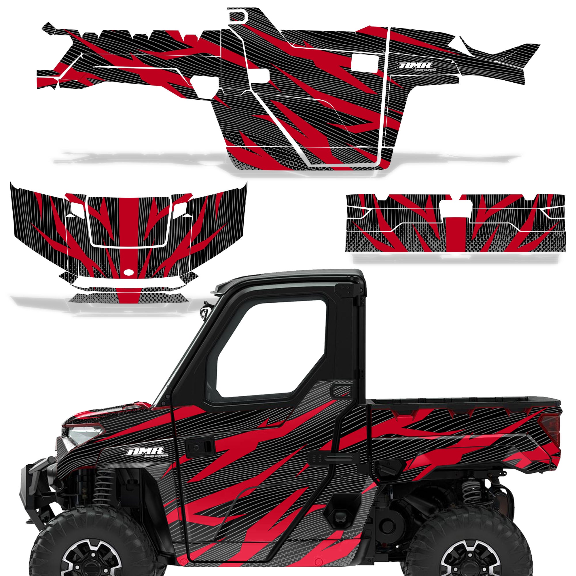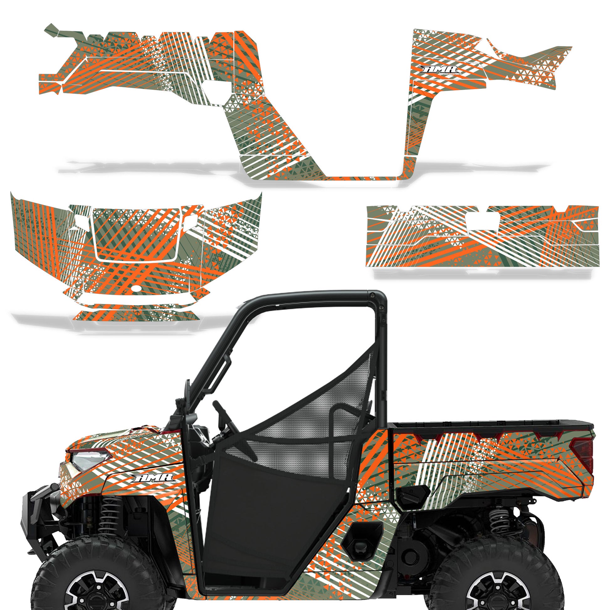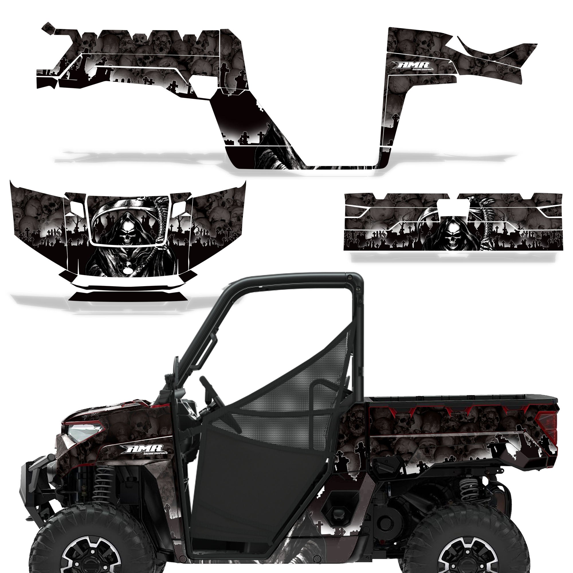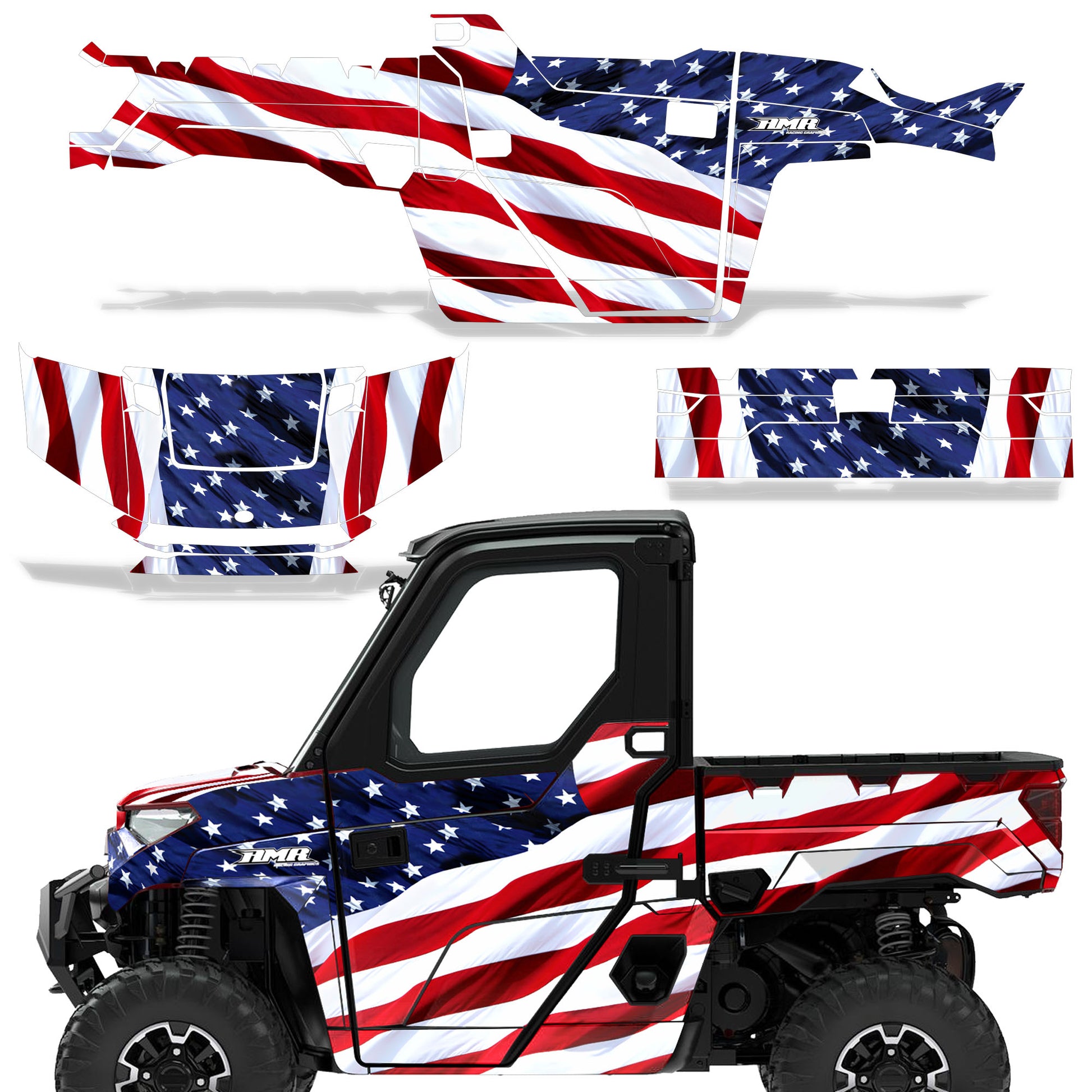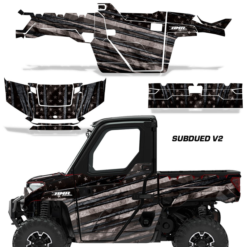 Polaris Ranger XP Premium Graphics are produced to order and may take up to 5 business days to manufacture. All graphics are digitally printed with UV resistant inks that are guaranteed not to fade up to 5 years. These are not your typical 3-4 color Silk-Screened graphics. Our digital technology produces extremely Vivid and detailed images, up to 16.5 million colors! We use the thickest layer of scratch-proof clear vinyl over laminate for an Armor Like layer of protection. Our adhesive assures your graphics won't be peeling off unless you want them to. All of our designs are available on all the models we carry. See close up images of each design on the grid below. You can also visit our Media Gallery to see how our graphics look on our customers' rides. Please Note that some of our designs have both Design Color and Background Color options. If you have any trouble ordering from the website, you may call us @ 702-312-2217 (m-f). Thank you for shopping at Amrracing.com, home of the......."THICKEST and TOUGHEST GRAPHICS ON THE PLANET"