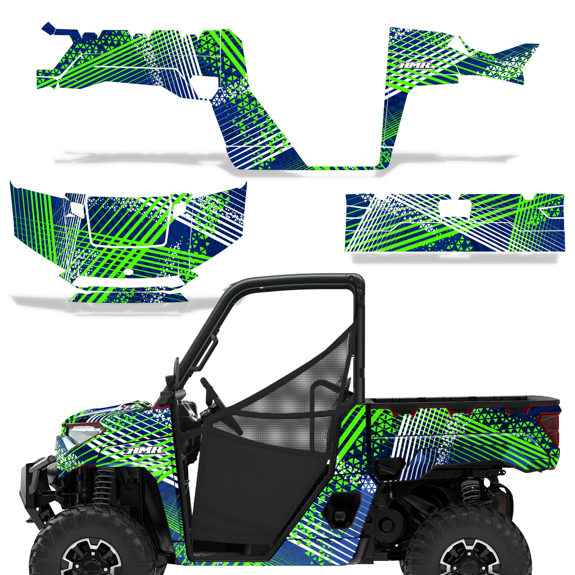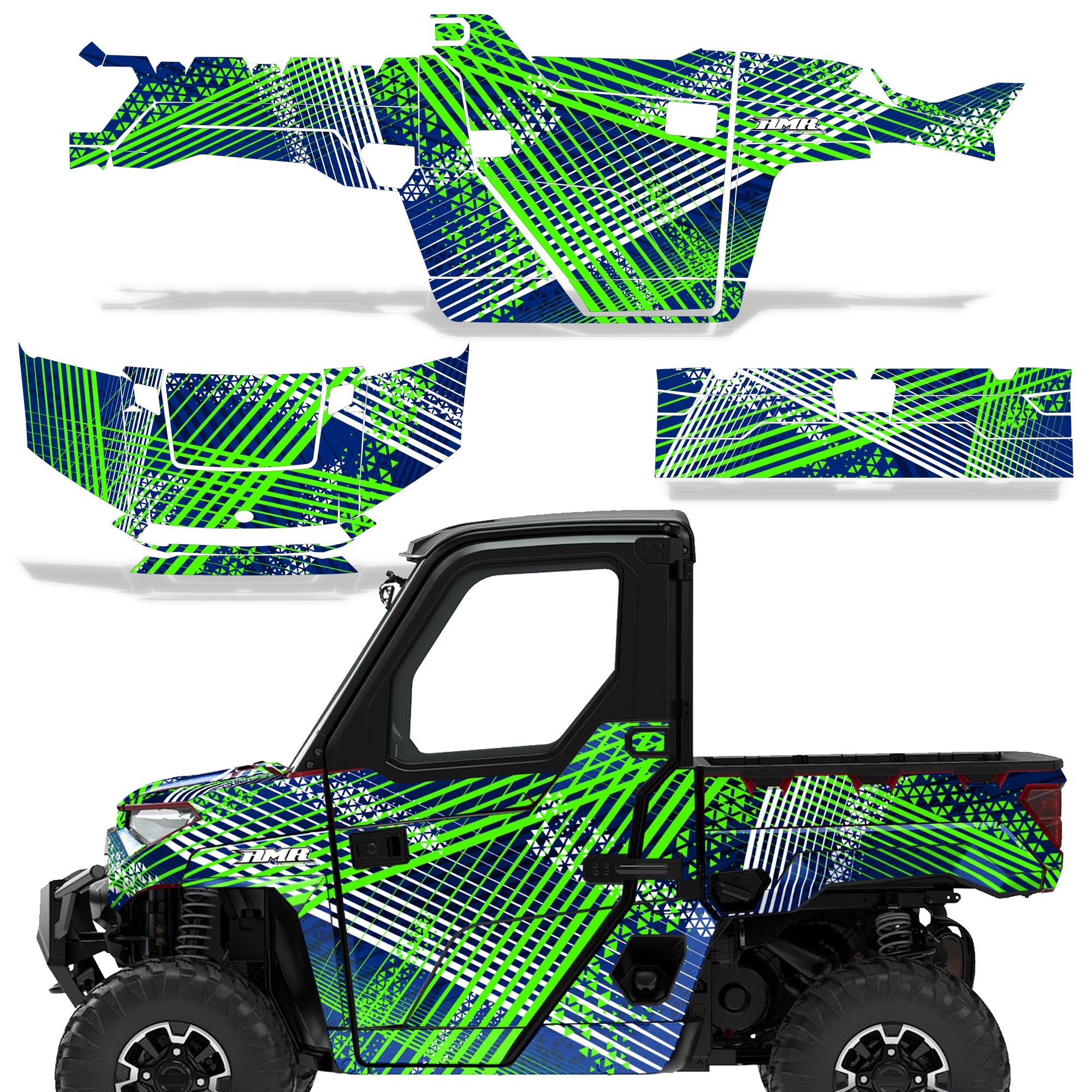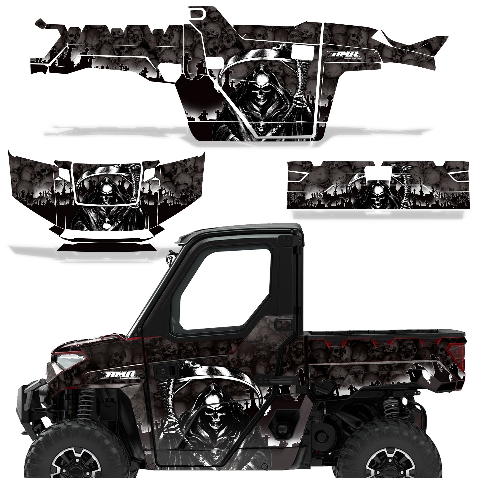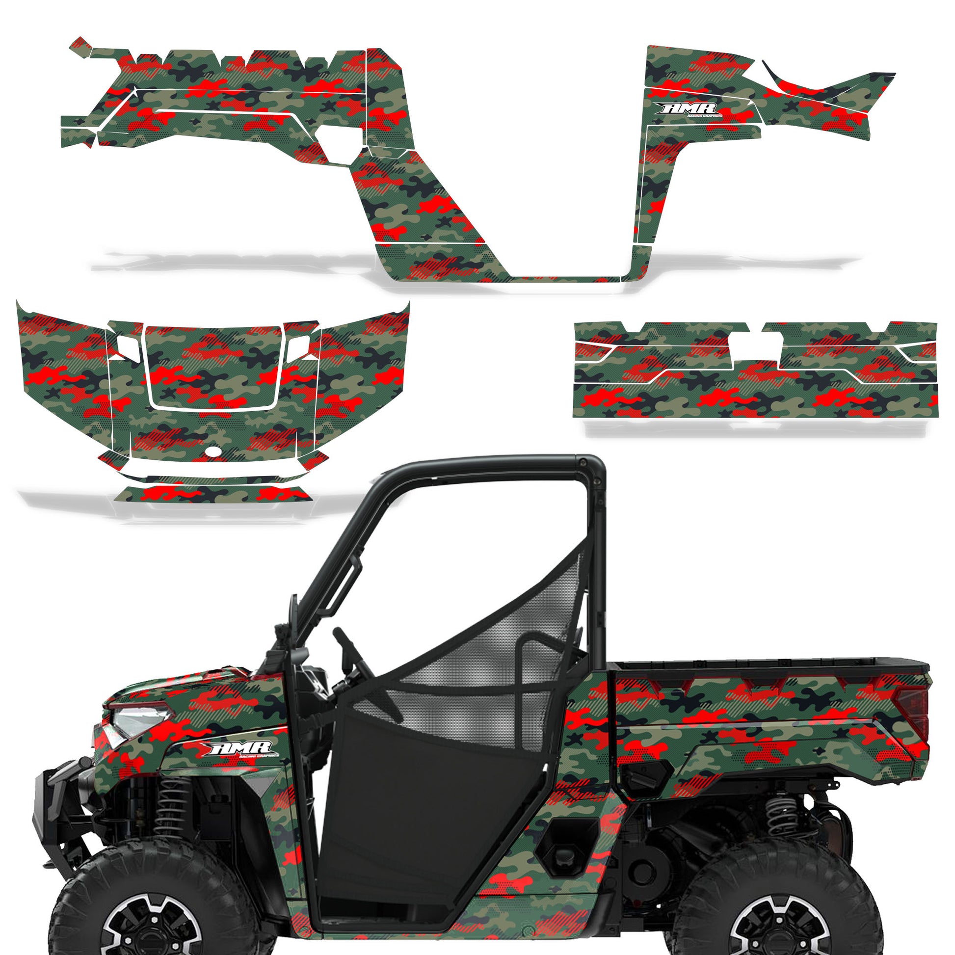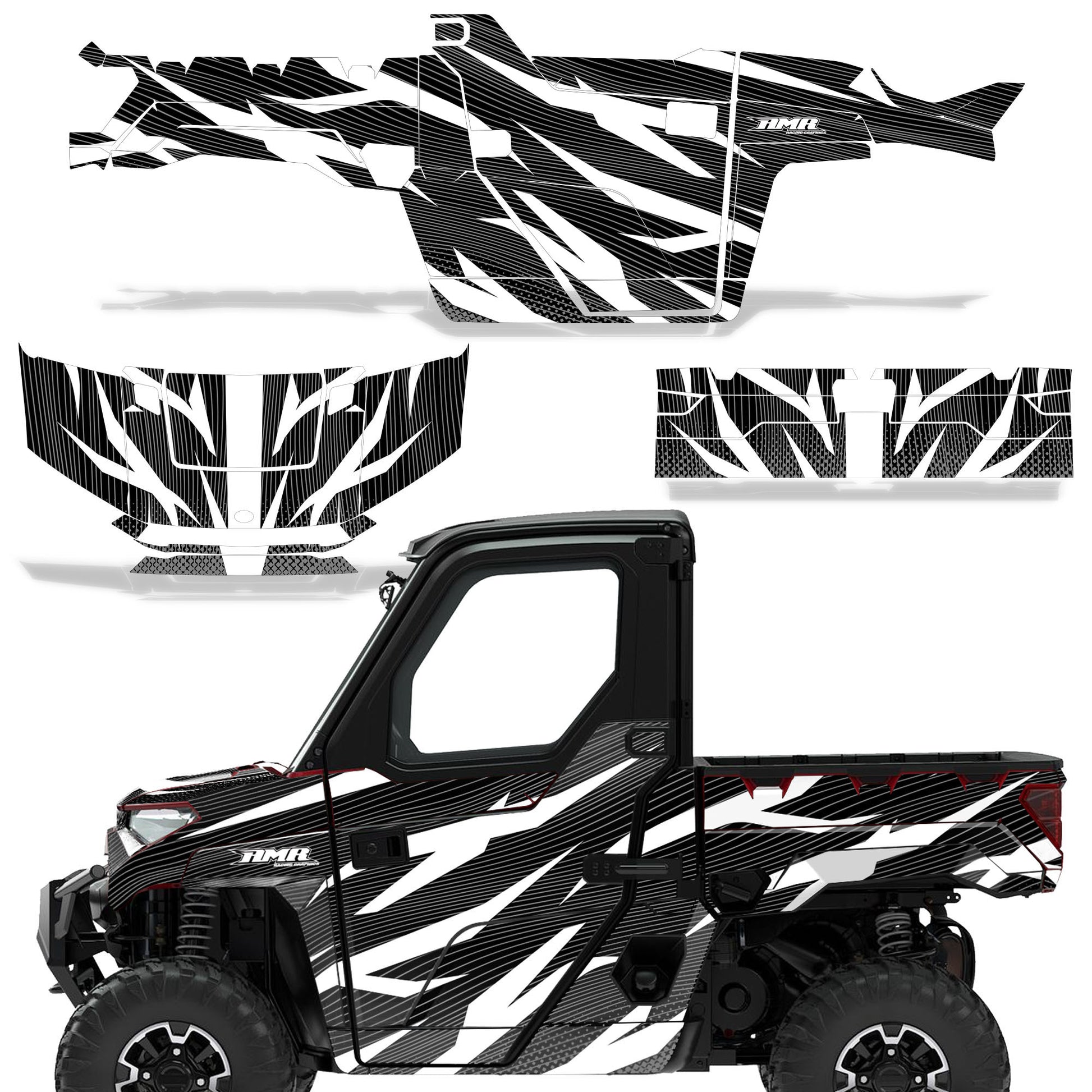 Polaris Ranger XP Premium Graphics are produced to order and may take up to 5 business days to manufacture. All graphics are digitally printed with UV resistant inks that are guaranteed not to fade up to 5 years. These are not your typical 3-4 color Silk-Screened graphics. Our digital technology produces extremely Vivid and detailed images, up to 16.5 million colors! We use the thickest layer of scratch-proof clear vinyl over laminate for an Armor Like layer of protection. Our adhesive assures your graphics won't be peeling off unless you want them to. All of our designs are available on all the models we carry. See close up images of each design on the grid below. You can also visit our Media Gallery to see how our graphics look on our customers' rides. Please Note that some of our designs have both Design Color and Background Color options. If you have any trouble ordering from the website, you may call us @ 702-312-2217 (m-f). Thank you for shopping at Amrracing.com, home of the......."THICKEST and TOUGHEST GRAPHICS ON THE PLANET"