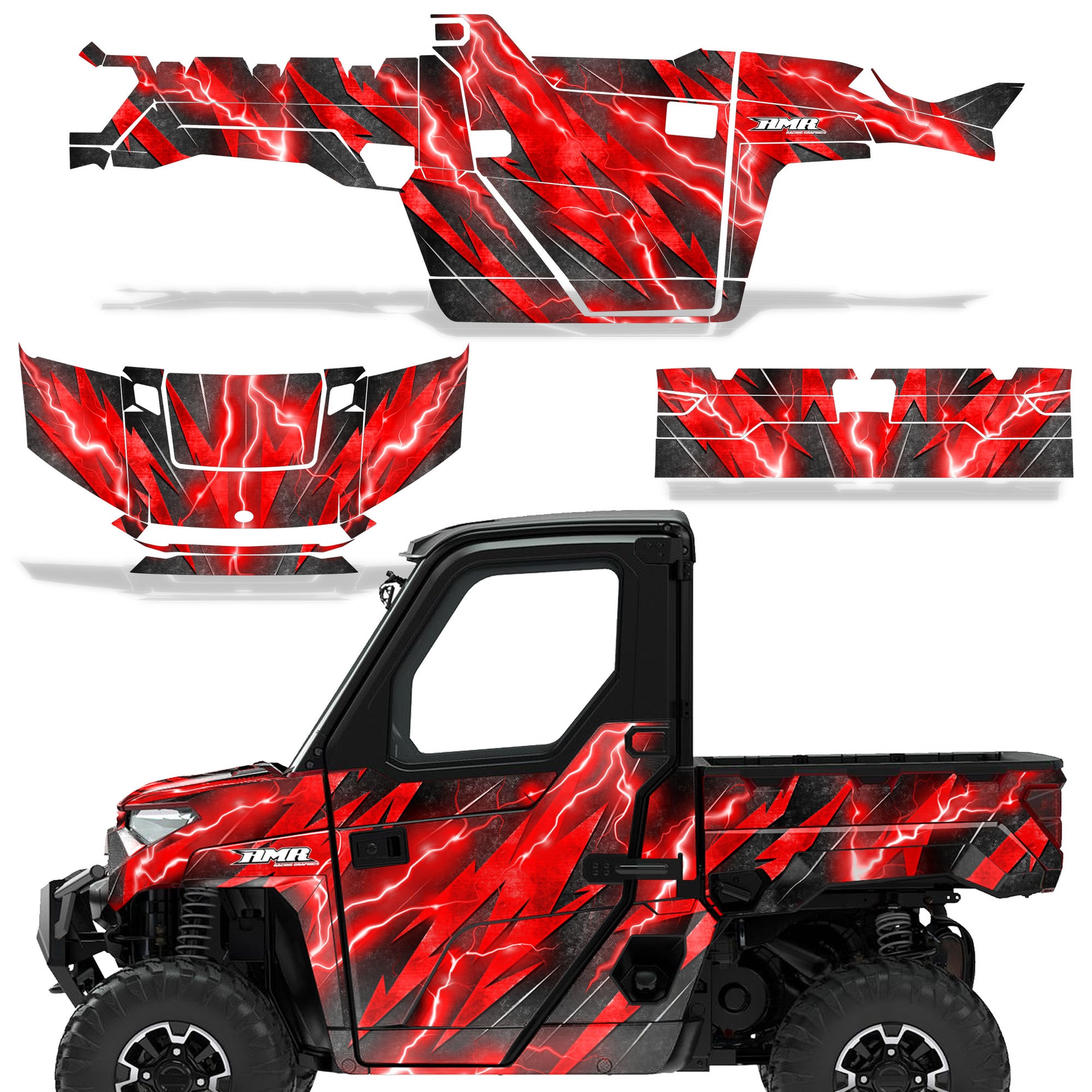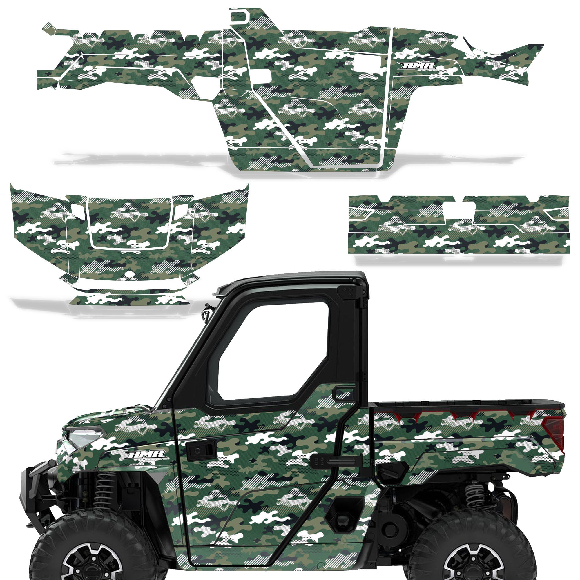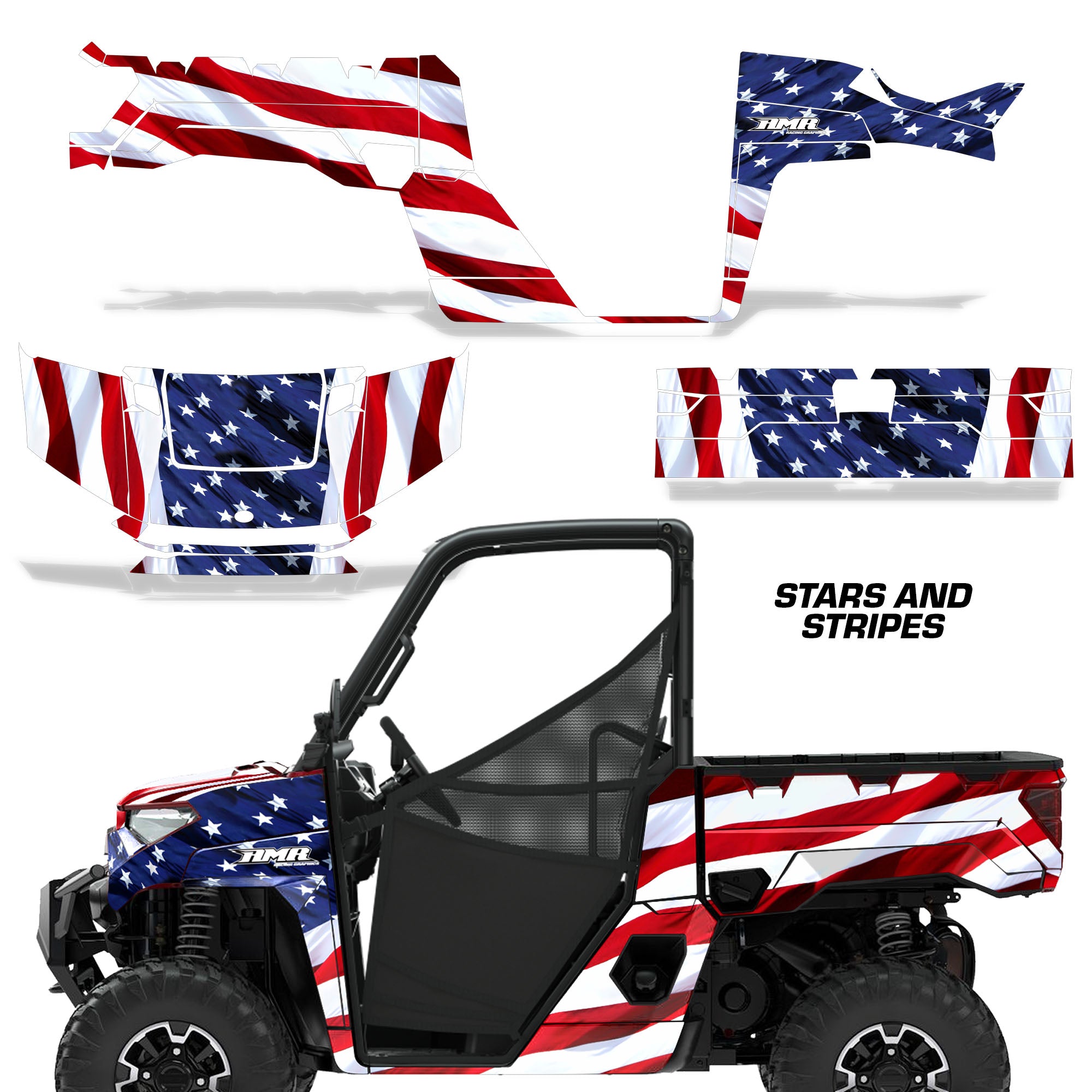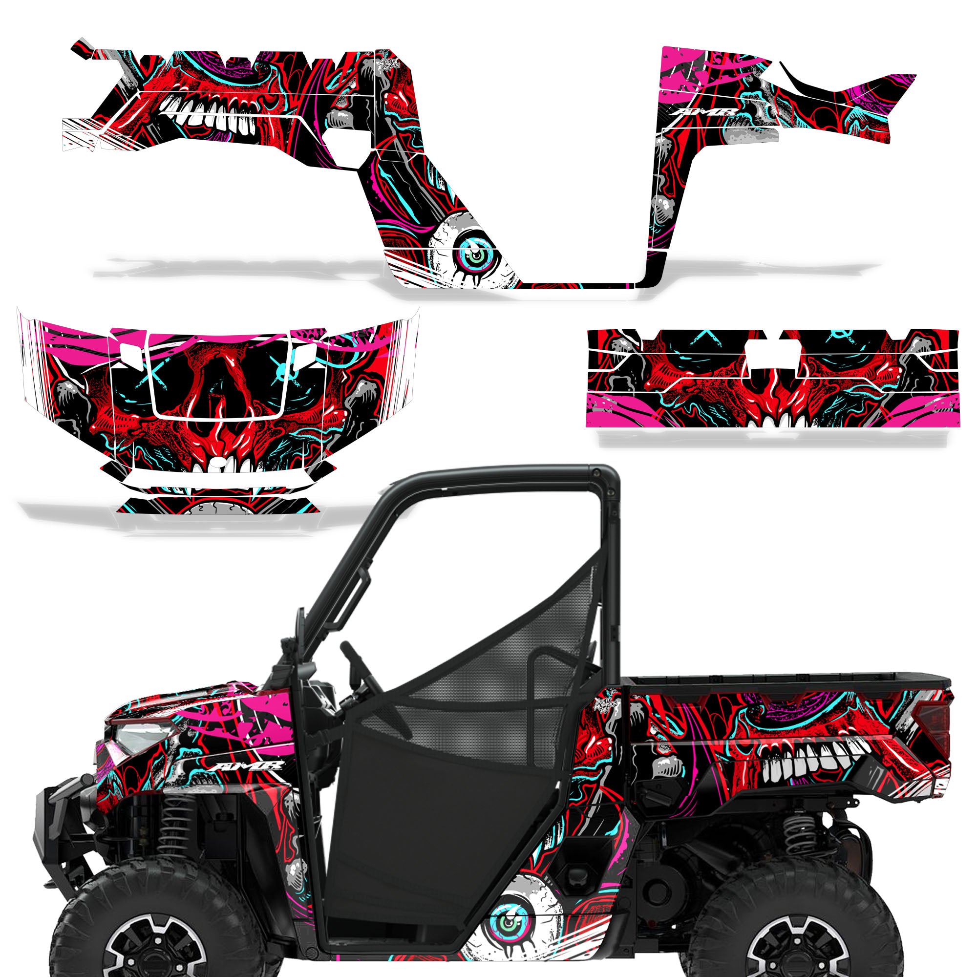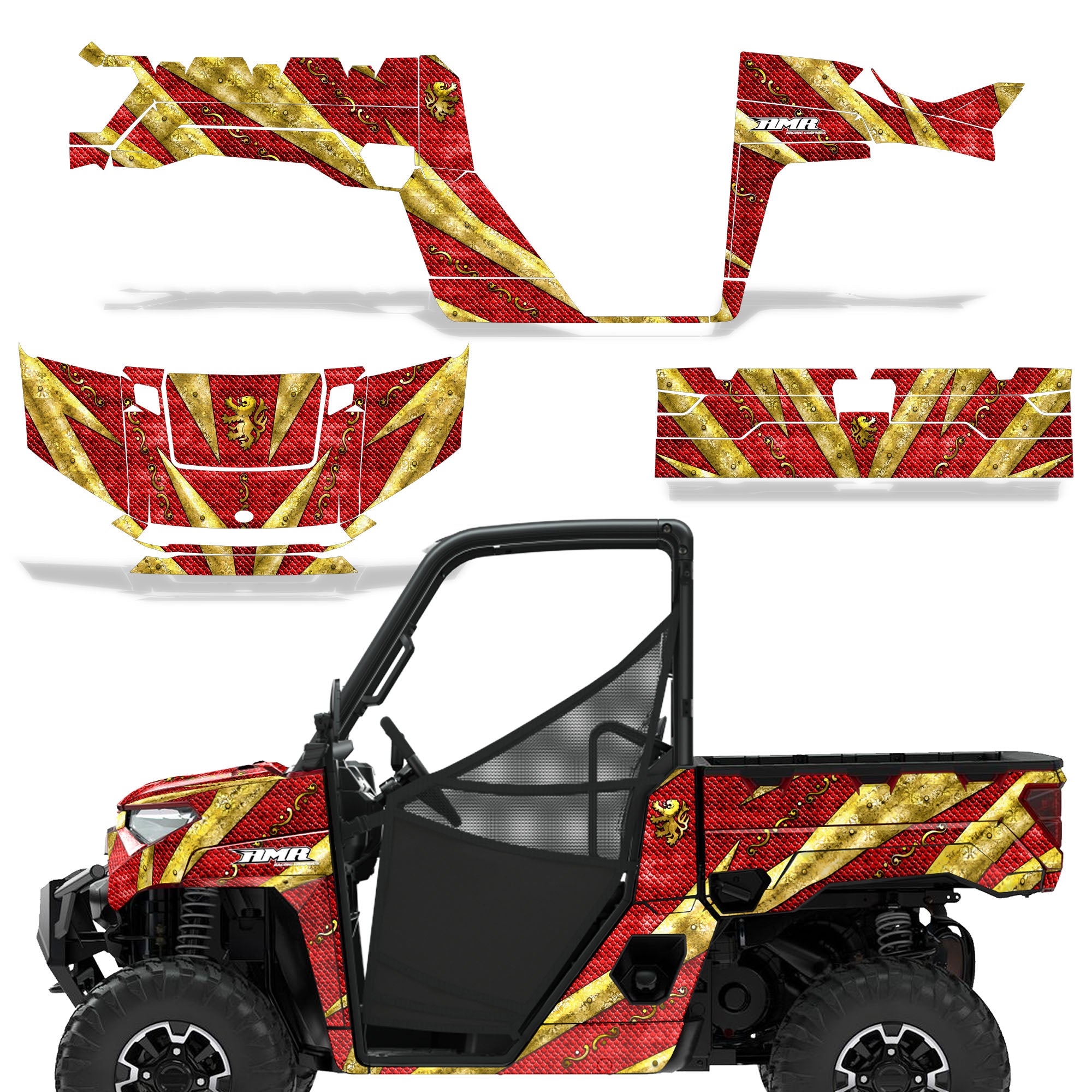 Polaris Ranger XP Premium Graphics are produced to order and may take up to 5 business days to manufacture. All graphics are digitally printed with UV resistant inks that are guaranteed not to fade up to 5 years. These are not your typical 3-4 color Silk-Screened graphics. Our digital technology produces extremely Vivid and detailed images, up to 16.5 million colors! We use the thickest layer of scratch-proof clear vinyl over laminate for an Armor Like layer of protection. Our adhesive assures your graphics won't be peeling off unless you want them to. All of our designs are available on all the models we carry. See close up images of each design on the grid below. You can also visit our Media Gallery to see how our graphics look on our customers' rides. Please Note that some of our designs have both Design Color and Background Color options. If you have any trouble ordering from the website, you may call us @ 702-312-2217 (m-f). Thank you for shopping at Amrracing.com, home of the......."THICKEST and TOUGHEST GRAPHICS ON THE PLANET"