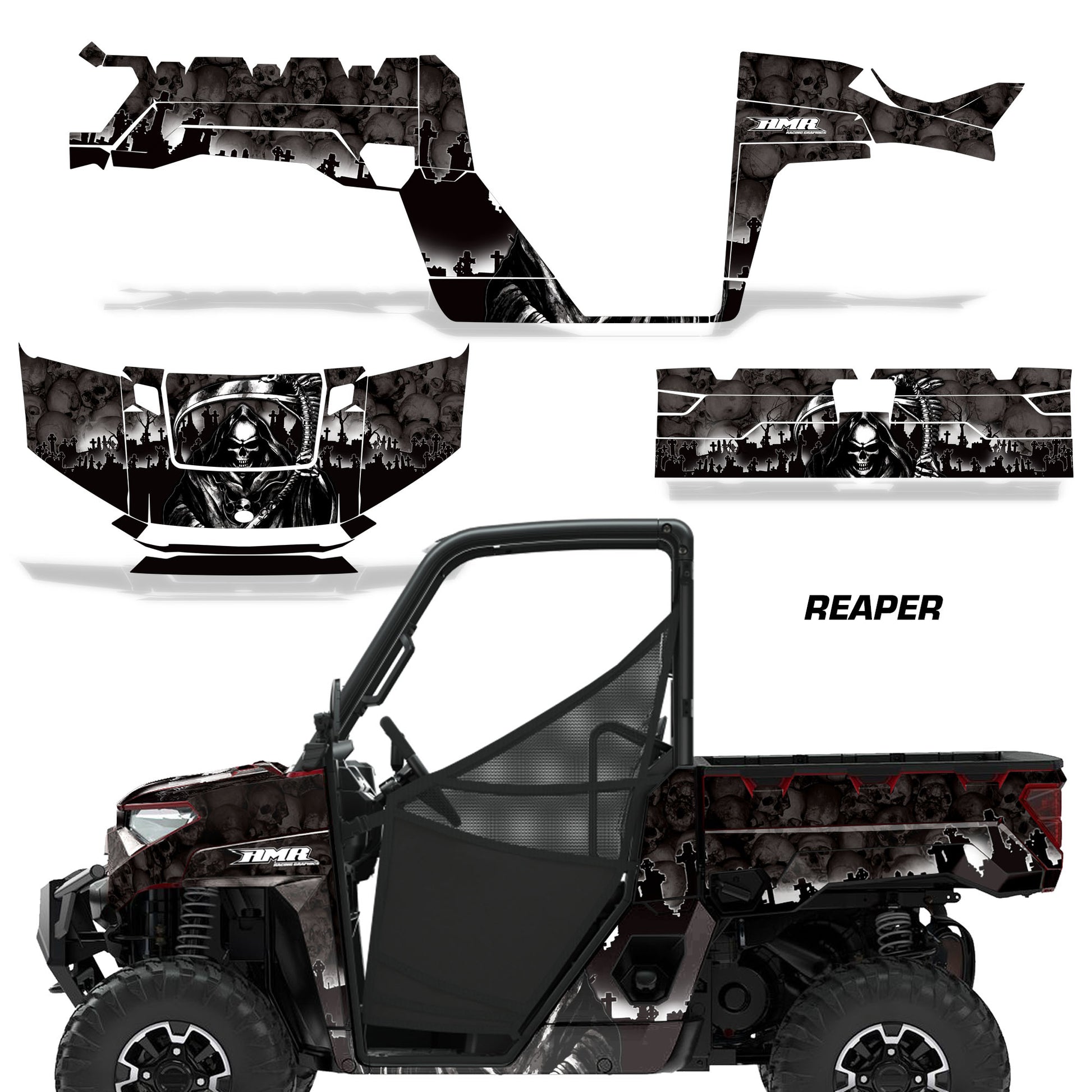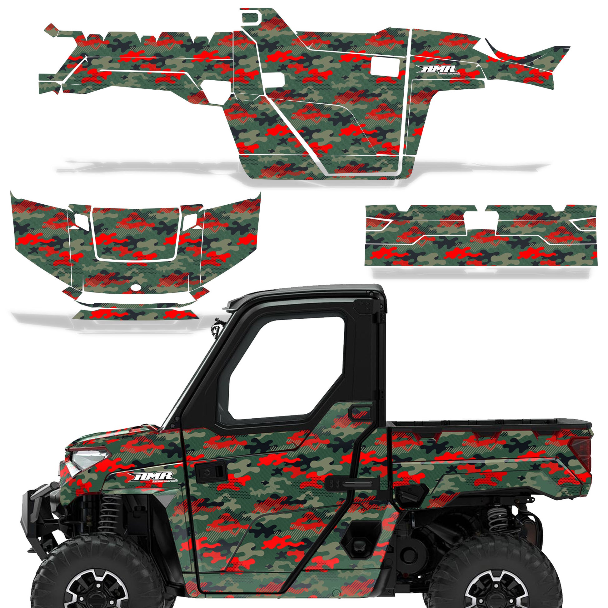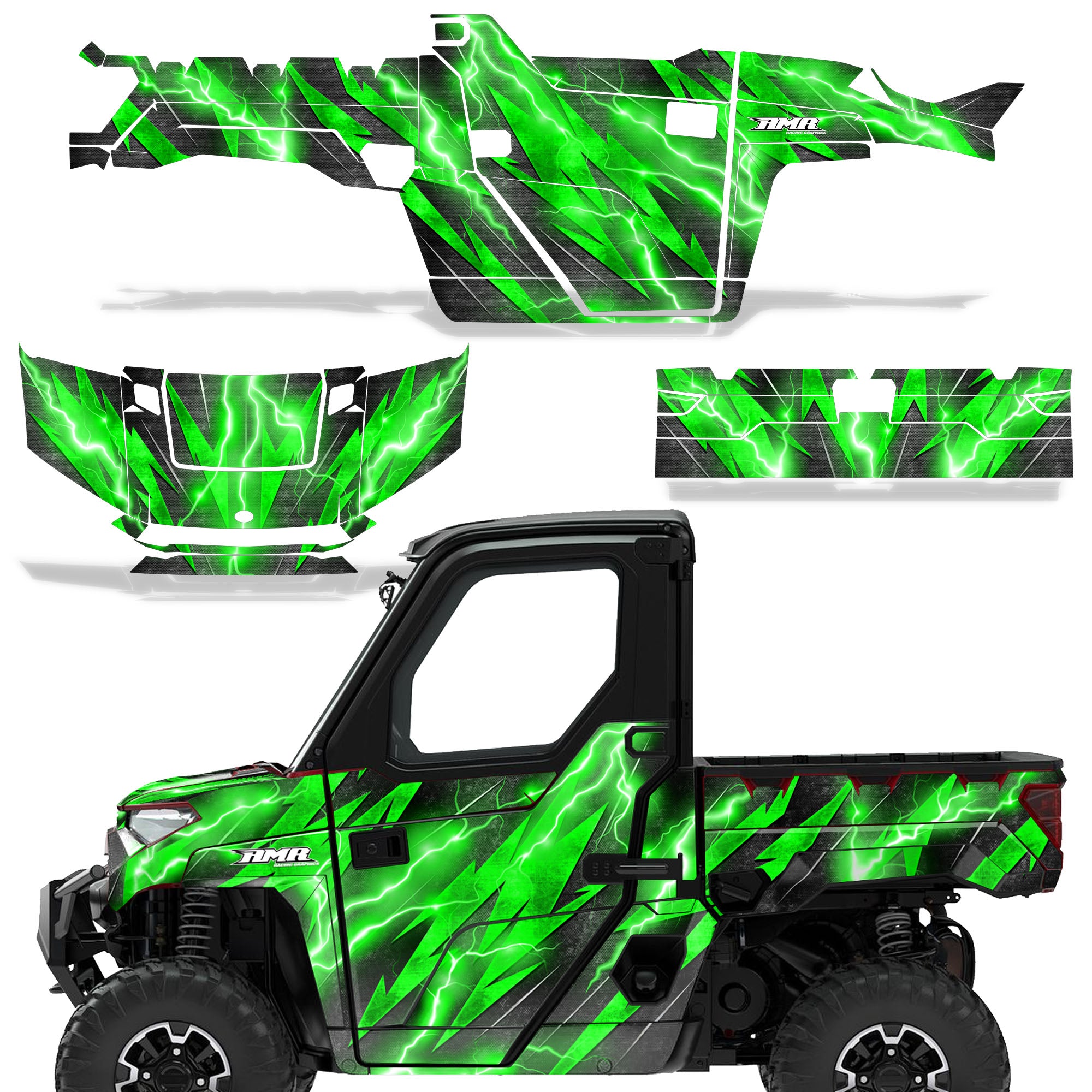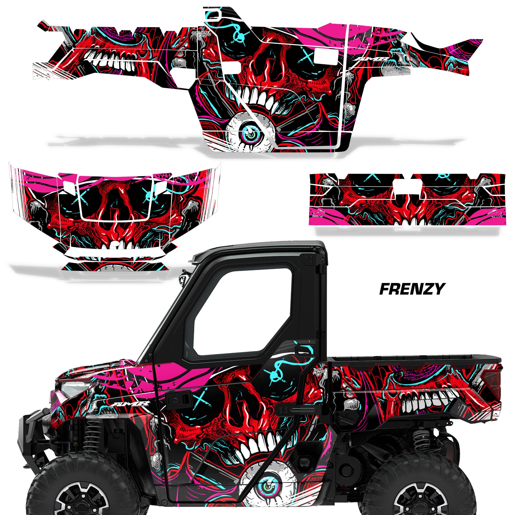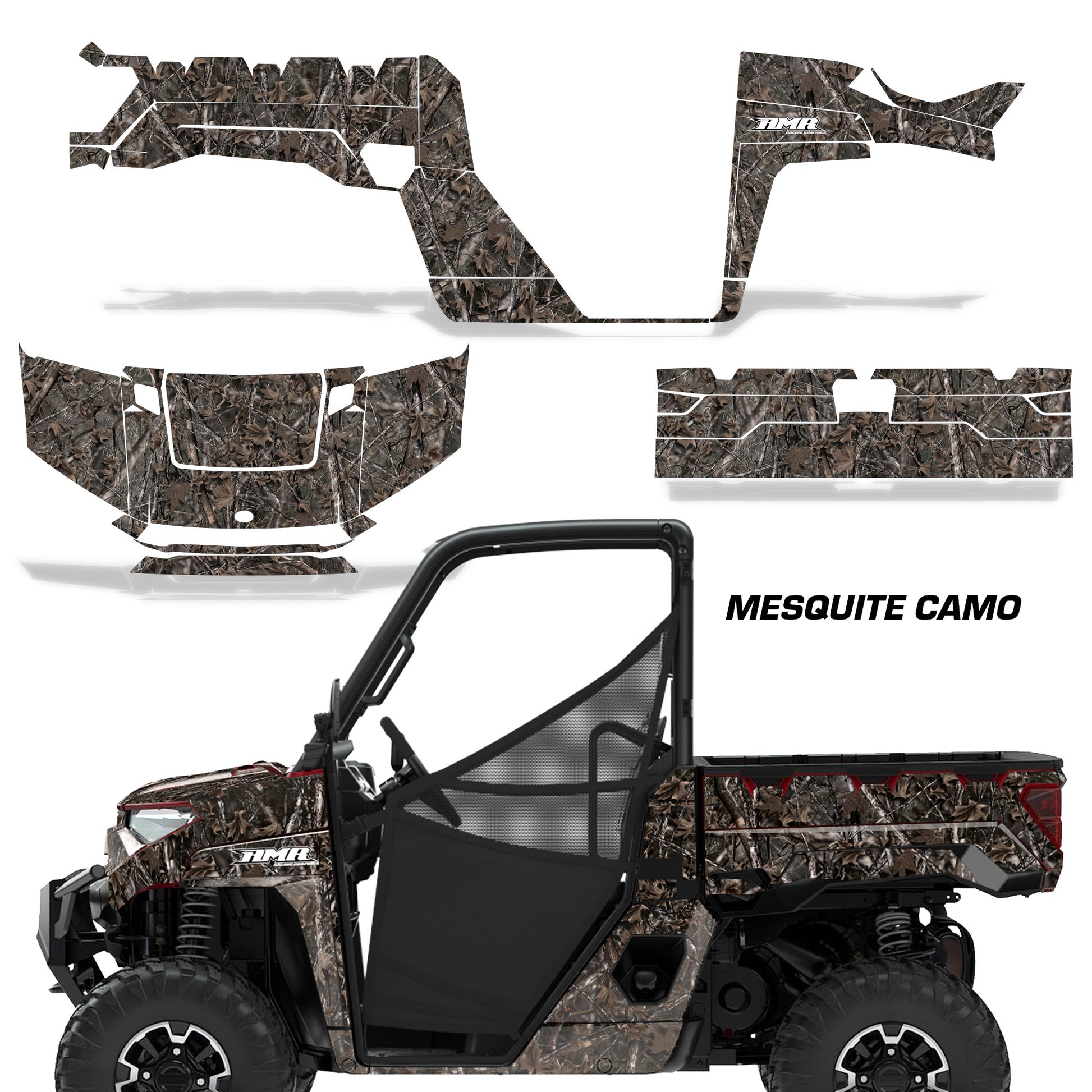 Polaris Ranger XP Premium Graphics are produced to order and may take up to 5 business days to manufacture. All graphics are digitally printed with UV resistant inks that are guaranteed not to fade up to 5 years. These are not your typical 3-4 color Silk-Screened graphics. Our digital technology produces extremely Vivid and detailed images, up to 16.5 million colors! We use the thickest layer of scratch-proof clear vinyl over laminate for an Armor Like layer of protection. Our adhesive assures your graphics won't be peeling off unless you want them to. All of our designs are available on all the models we carry. See close up images of each design on the grid below. You can also visit our Media Gallery to see how our graphics look on our customers' rides. Please Note that some of our designs have both Design Color and Background Color options. If you have any trouble ordering from the website, you may call us @ 702-312-2217 (m-f). Thank you for shopping at Amrracing.com, home of the......."THICKEST and TOUGHEST GRAPHICS ON THE PLANET"