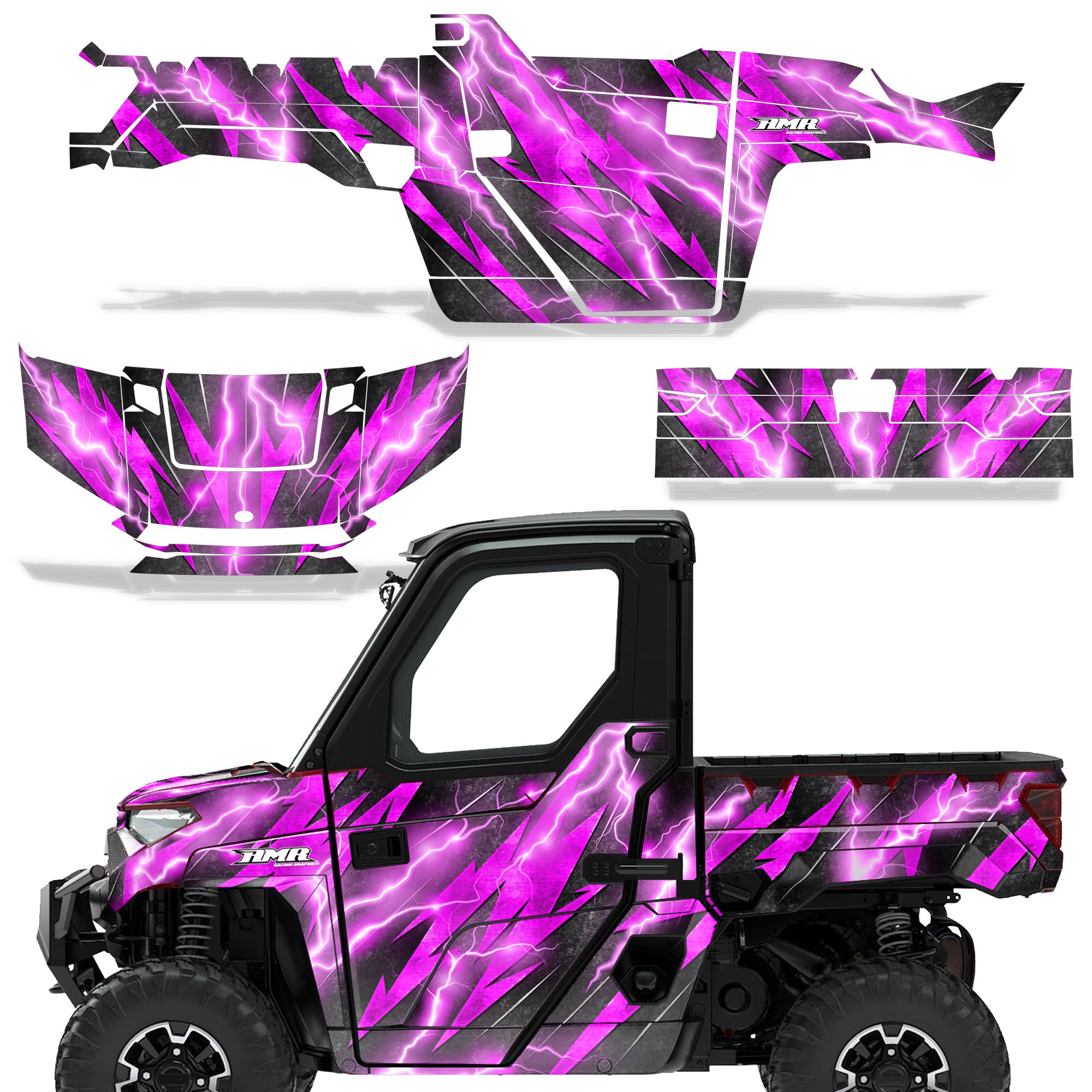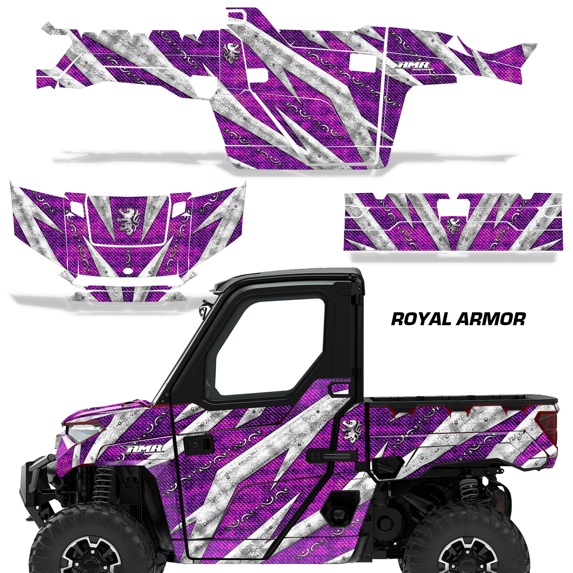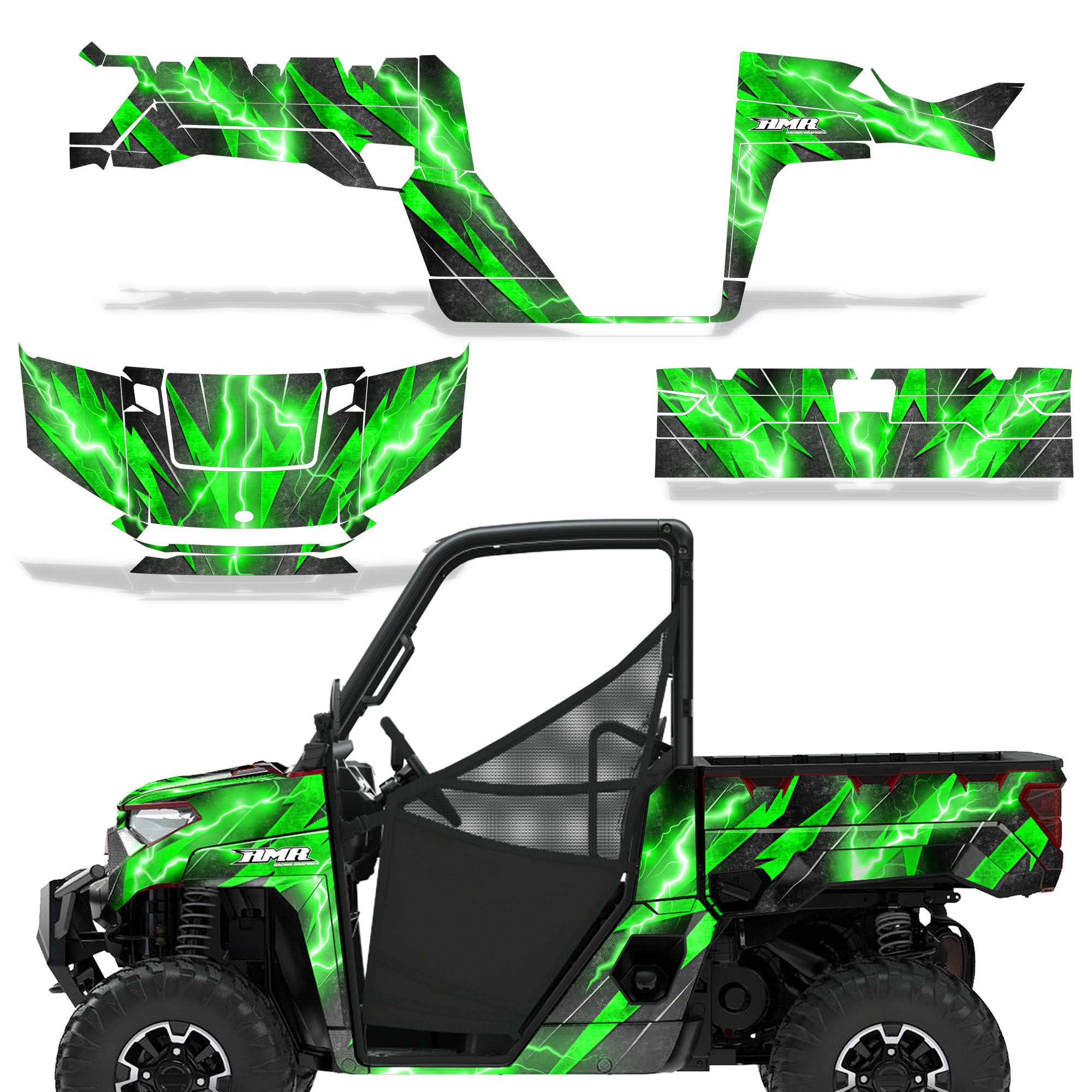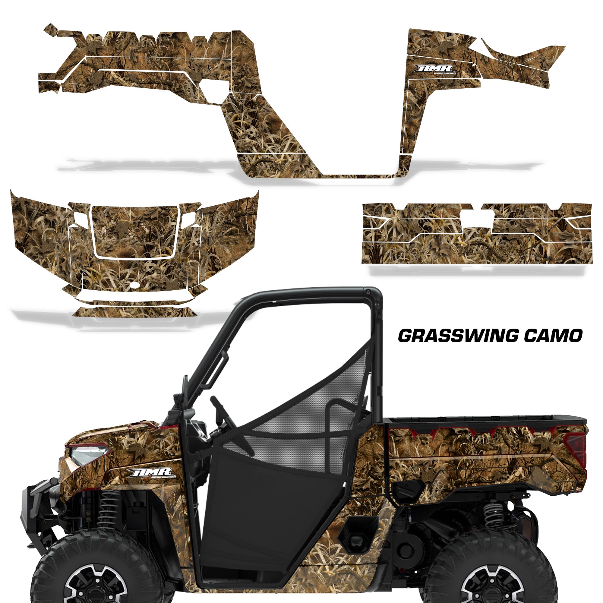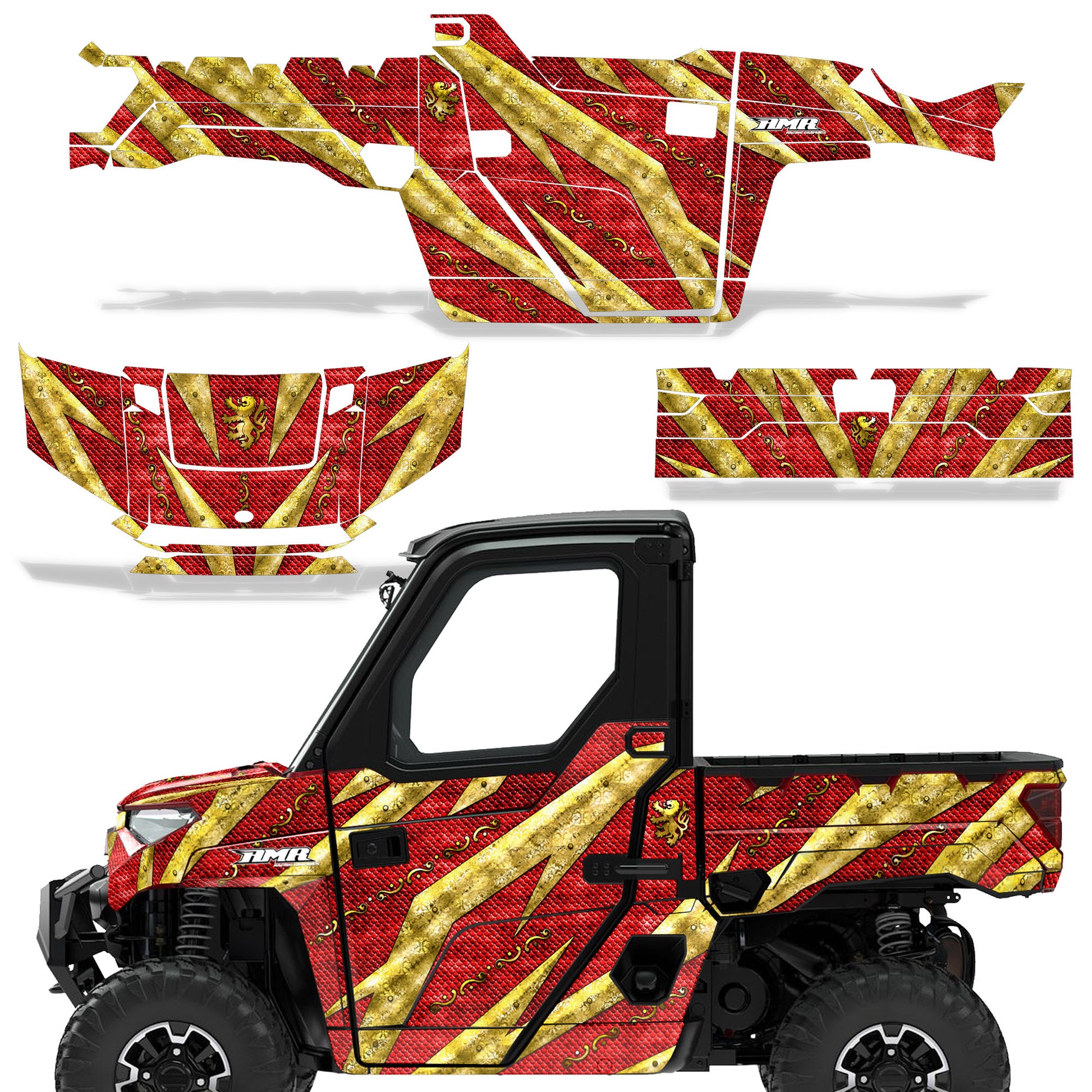 Polaris Ranger XP Premium Graphics are produced to order and may take up to 5 business days to manufacture. All graphics are digitally printed with UV resistant inks that are guaranteed not to fade up to 5 years. These are not your typical 3-4 color Silk-Screened graphics. Our digital technology produces extremely Vivid and detailed images, up to 16.5 million colors! We use the thickest layer of scratch-proof clear vinyl over laminate for an Armor Like layer of protection. Our adhesive assures your graphics won't be peeling off unless you want them to. All of our designs are available on all the models we carry. See close up images of each design on the grid below. You can also visit our Media Gallery to see how our graphics look on our customers' rides. Please Note that some of our designs have both Design Color and Background Color options. If you have any trouble ordering from the website, you may call us @ 702-312-2217 (m-f). Thank you for shopping at Amrracing.com, home of the......."THICKEST and TOUGHEST GRAPHICS ON THE PLANET"