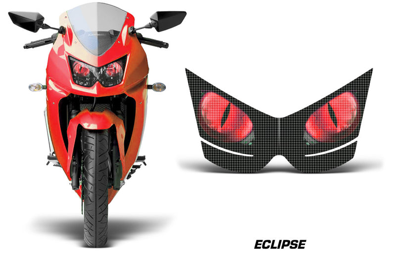 These Headlight Eyes Fits 2008-2012 Kawasaki 250R. AMR Headlight graphics are printed on a perforated window film material. Design is visible from the front and light still passes through from the back. Product is very easy to install and also protects the headlight.