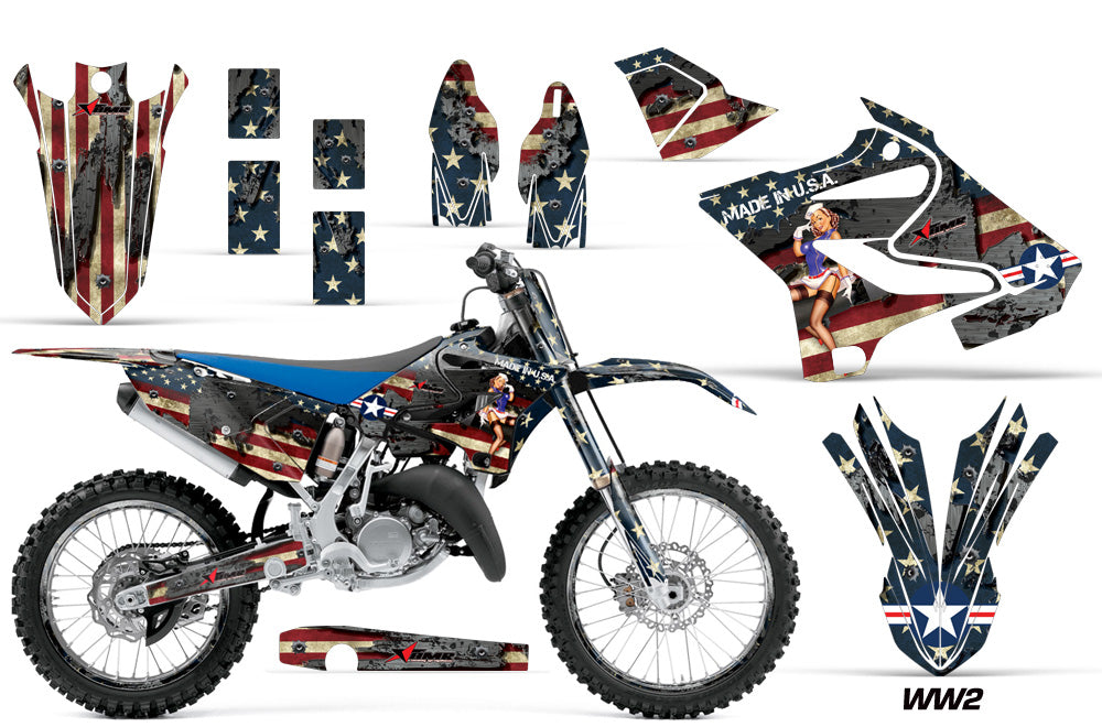Yamaha YZ 125/250 Premium Graphics are produced to order and may take up to 5 business days to manufacture. All graphics are digitally printed with UV resistant inks. These are not your typical 3-4 color Silk-Screened graphics. Our digital technology produces extremely Vivid and detailed images, up to 16.5 million colors! We use the thickest layer of scratch-proof clear vinyl over laminate for an Armor Like layer of protection. Our adhesive assures your graphics won't be peeling off unless you want them to. All of our designs are available on all the models we carry. See close up images of each design on the grid below. You can also visit our Media Gallery to see how our graphics look on our customers' rides. Please Note that some of our designs have both Design Color and Background Color options. If you have any trouble ordering from the website, you may call us @ 702-312-2217 (m-f). Thank you for shopping at Amrracing.com, home of the......."THICKEST and TOUGHEST GRAPHICS ON THE PLANET"